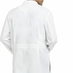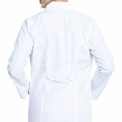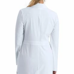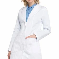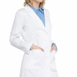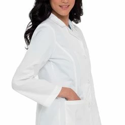 This women’s lab coat from Cherokee has a fit, flare silhouette. It features a notched collar with front yokes and front and back princess seams along with 2 Roomy double patch pockets, stitched-down instrument holders, center back vents and adjustable back button tabs.