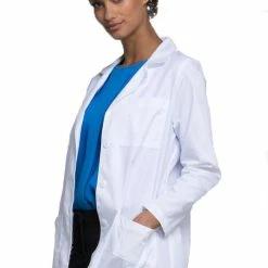 This longer length women’s lab coat has a notched collar and three-button front. It features 5 pockets: chest pocket, 2 patch pockets, beeper pocket and interior cell phone pocket. This scrub top is made of soil-release poly/cotton twill.