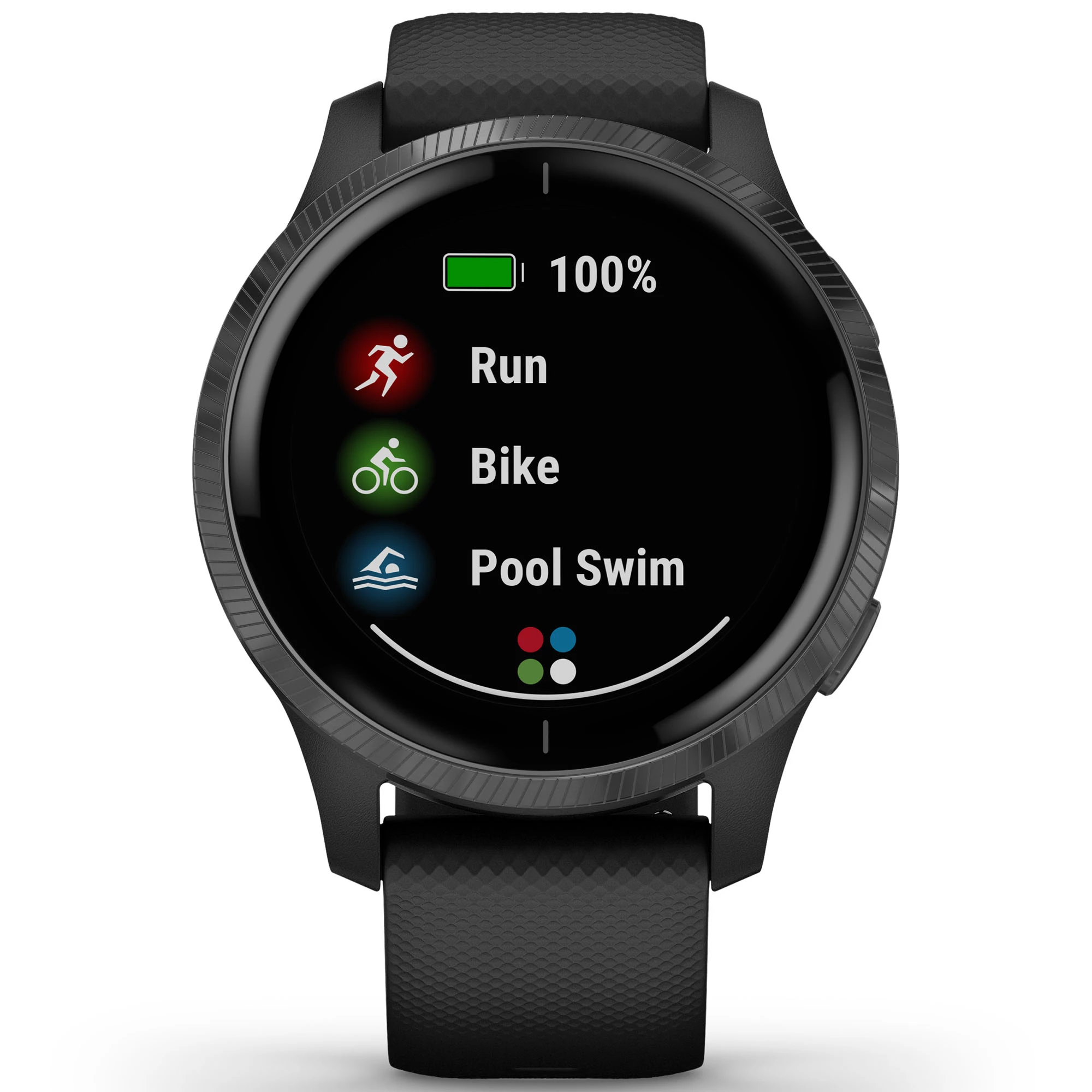 The Garmin Venu⢠GPS Smartwatch offers a beautiful, detailed, and fun design, helping you spend more time doing the activities you love while staying in tune with your body. This watch is designed for your busy lifestyle, as its beautiful AMOLED display brings your watch to life, even under bright sunlight as it is made from durable Corning® Gorilla® Glass 3. This watch will help you keep track of your vitals and more thanks to its Body Battery⢠Energy Monitoring which tracks your energy levels throughout the day so you can find the best times for activity and rest, as well as a Pulse OX Sensor that gauges your blood oxygen saturation during the day and as you sleep to show how well your body is absorbing oxygen. Keep track of your stress, hydration, respiration and sleeping patters thanks to its multiple sensors and the Garmin Connect⢠app that will even help you track your menstrual cycle or pregnancy, offering symptoms logs as well as exercise and nutrition education and more. Track all the ways you move with more than 20 preloaded GPS and indoor sports apps, and step up your game with Garmin Coach which offers a personal running coach on your wrist, for free, to help you train for your next 5K, 10K or half-marathon. Get all your notifications so you can stay on top of your busy schedule and relax with your favorite music as this watch lets you download songs plus playlists from your Spotify®, Deezer or Amazon Music accounts. Stay on the move longer with a battery life that lasts up to 5 days in smartwatch mode and up to 6 hours in GPS mode with music while having the peace of mind that it is water-rated to 5 ATM, making it perfect for a swim, shower or spa day. The Garmin Venu⢠GPS Smartwatch will become your favorite partner!