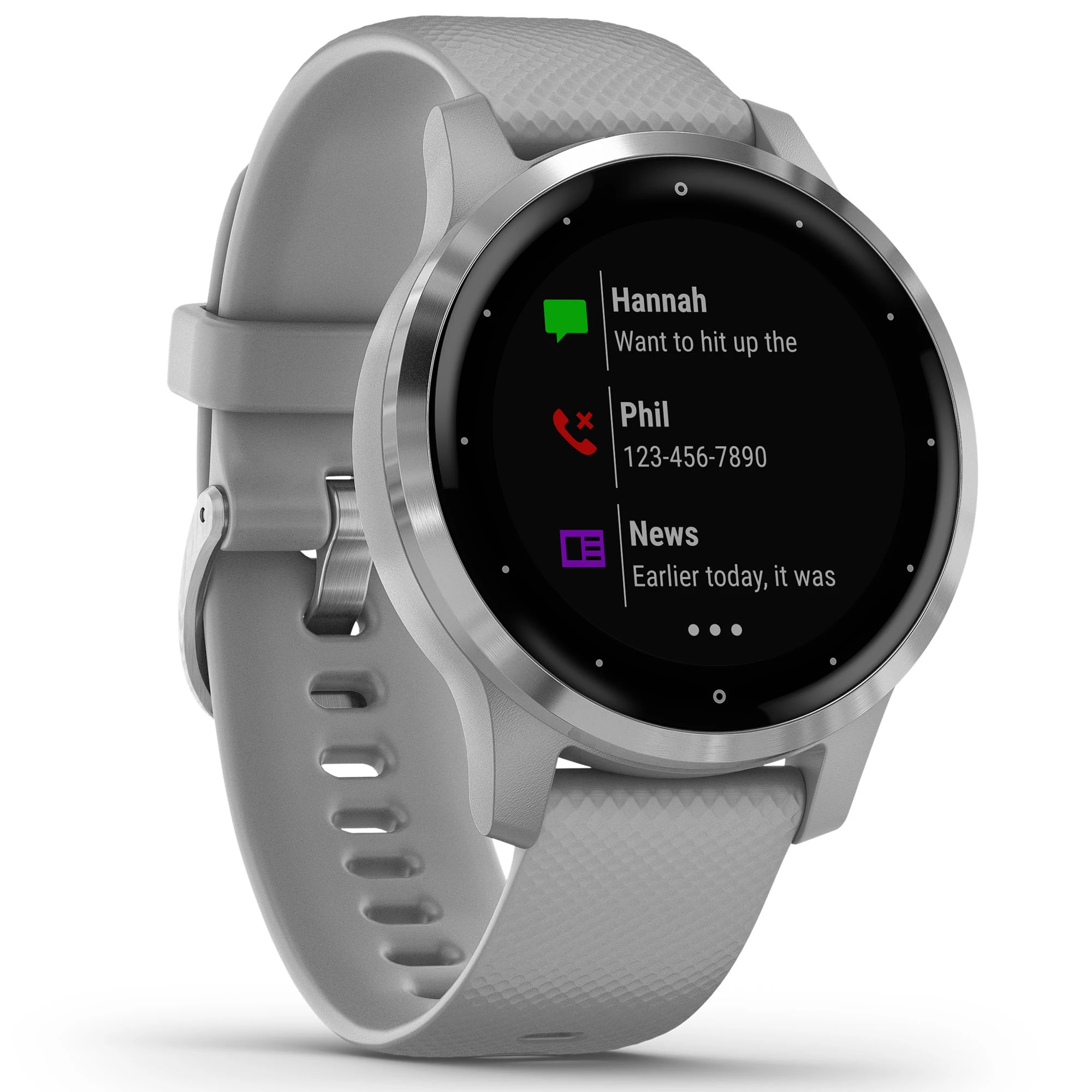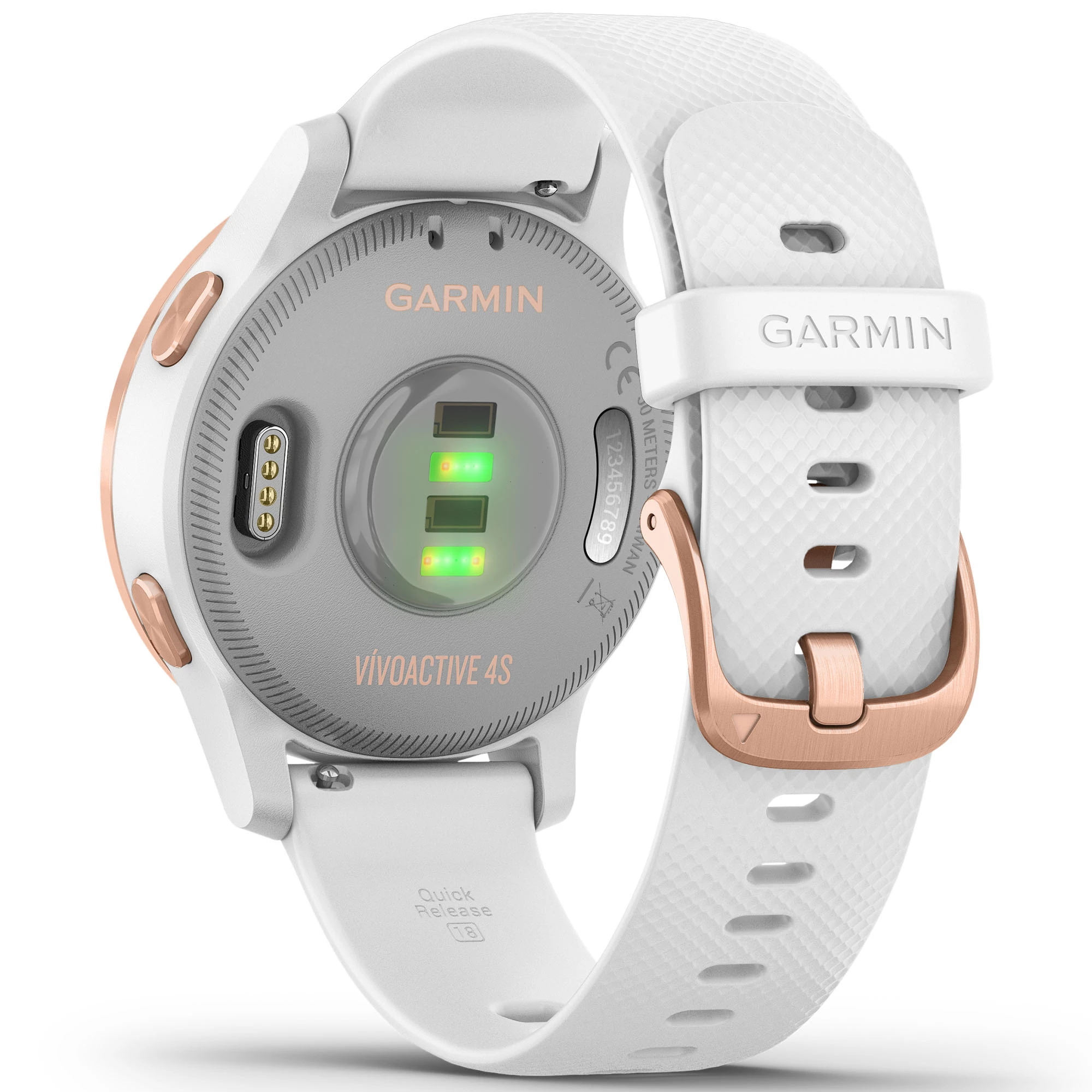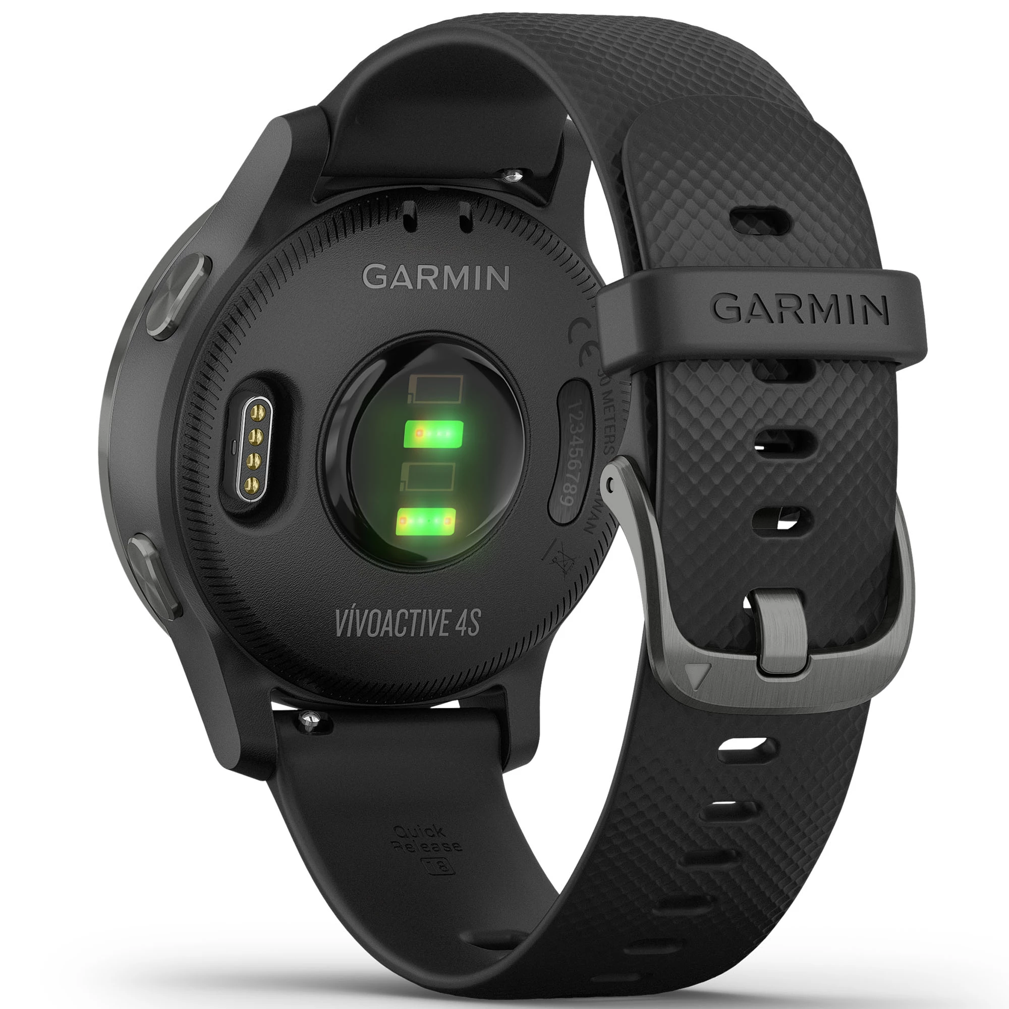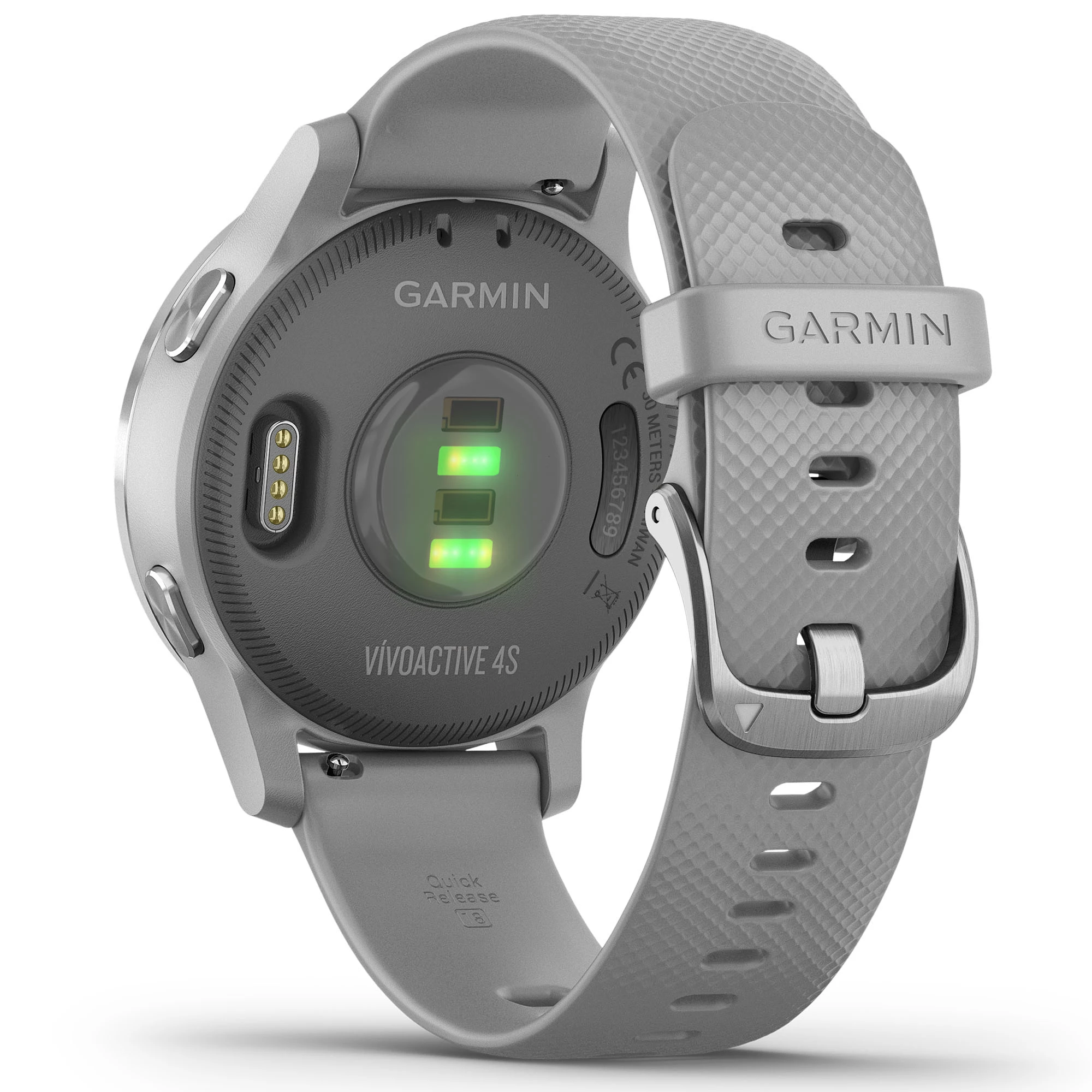 The Garmin vívoactive® 4S GPS Smartwatch offers multiple ways to track your health, performance and more to help you reach your health and fitness goals. This watch features the sunlight-readable Garmin Chroma Display™ technology which is housed under durable Corning® Gorilla® Glass 3 that is tough enough for you to go all in during your activities. This watch will help you keep track of your vitals and more thanks to its Body Battery™ Energy Monitoring which tracks your energy levels throughout the day so you can find the best times for activity and rest, as well as a Pulse OX Sensor that gauges your blood oxygen saturation during the day and as you sleep to show how well your body is absorbing oxygen. Keep track of your stress, hydration, respiration and sleeping patters thanks to its multiple sensors and the Garmin Connect™ app that will even help you track your menstrual cycle or pregnancy, offering symptoms logs as well as exercise and nutrition education and more. Track all the ways you move with more than 20 preloaded GPS and indoor sports apps, and step up your game with Garmin Coach which offers a personal running coach on your wrist, for free, to help you train for your next 5K, 10K or half-marathon. Get all your notifications so you can stay on top of your busy schedule and relax with your favorite music as this watch lets you download songs plus playlists from your Spotify®, Deezer or Amazon Music accounts. Stay on the move longer with a battery life that lasts up to 5 days in smartwatch mode and up to 5 hours in GPS mode with music while having the peace of mind that it is water-rated to 5 ATM, making it perfect for a swim, shower or spa day. Get the watch that matches all your lifestyle needs with the Garmin vívoactive® 4S GPS Smartwatch!