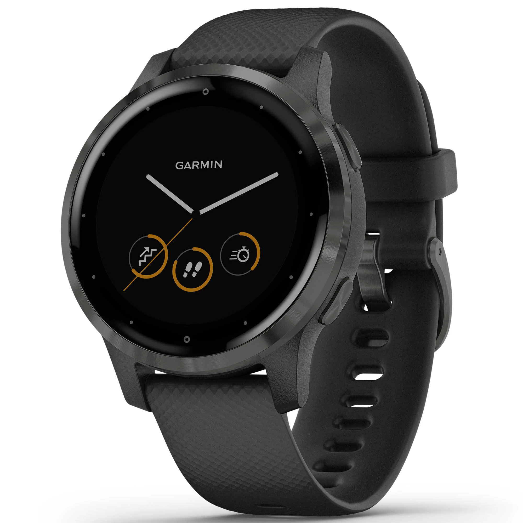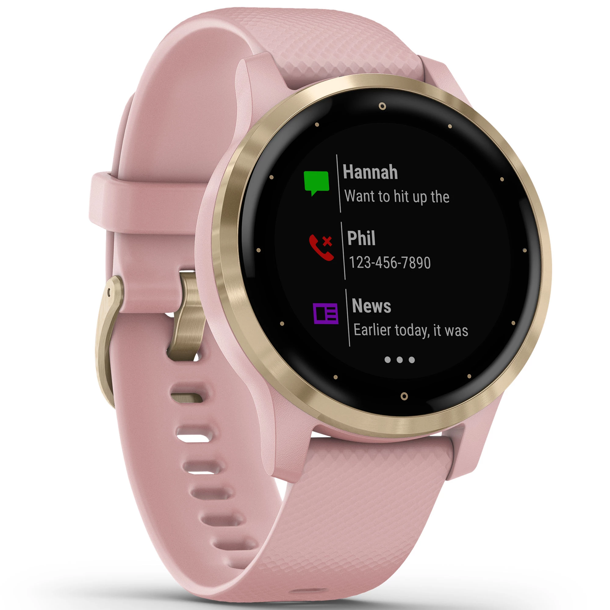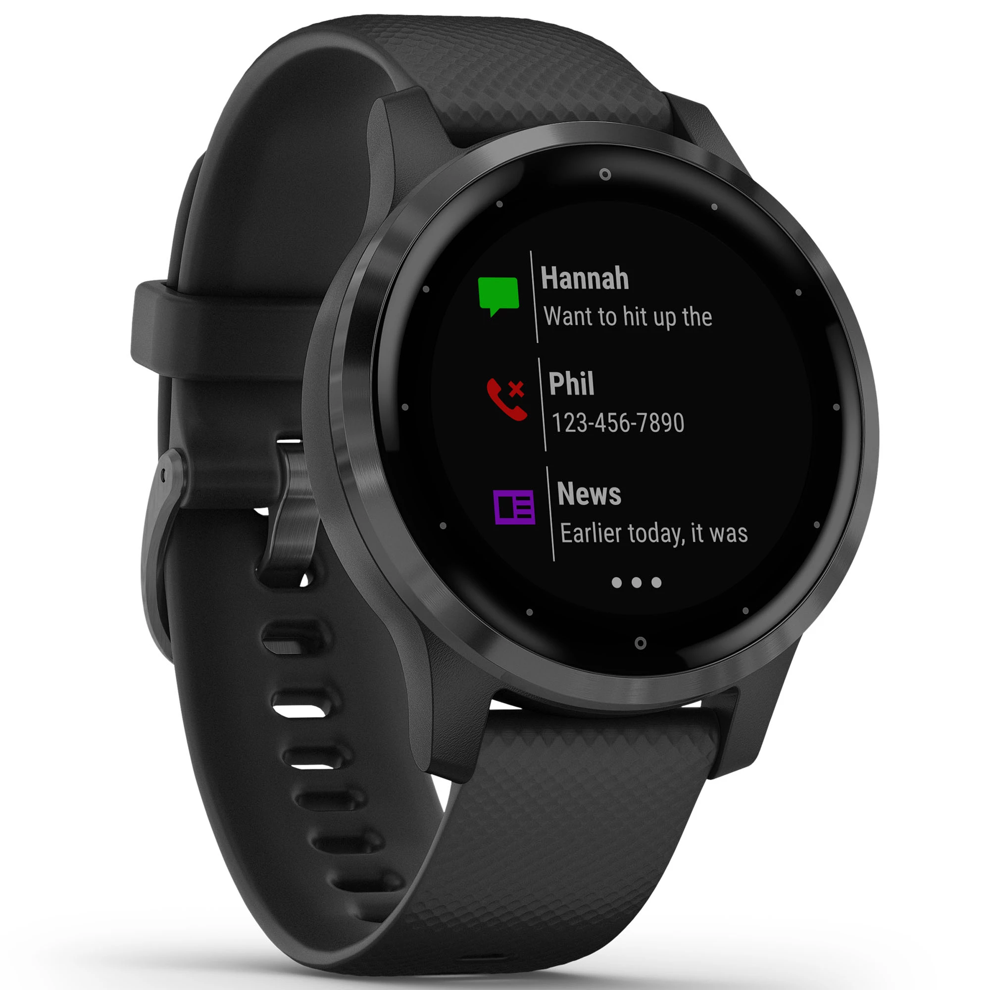 The Garmin vívoactive® 4S GPS Smartwatch offers multiple ways to track your health, performance and more to help you reach your health and fitness goals. This watch features the sunlight-readable Garmin Chroma Display™ technology which is housed under durable Corning® Gorilla® Glass 3 that is tough enough for you to go all in during your activities. This watch will help you keep track of your vitals and more thanks to its Body Battery™ Energy Monitoring which tracks your energy levels throughout the day so you can find the best times for activity and rest, as well as a Pulse OX Sensor that gauges your blood oxygen saturation during the day and as you sleep to show how well your body is absorbing oxygen. Keep track of your stress, hydration, respiration and sleeping patters thanks to its multiple sensors and the Garmin Connect™ app that will even help you track your menstrual cycle or pregnancy, offering symptoms logs as well as exercise and nutrition education and more. Track all the ways you move with more than 20 preloaded GPS and indoor sports apps, and step up your game with Garmin Coach which offers a personal running coach on your wrist, for free, to help you train for your next 5K, 10K or half-marathon. Get all your notifications so you can stay on top of your busy schedule and relax with your favorite music as this watch lets you download songs plus playlists from your Spotify®, Deezer or Amazon Music accounts. Stay on the move longer with a battery life that lasts up to 5 days in smartwatch mode and up to 5 hours in GPS mode with music while having the peace of mind that it is water-rated to 5 ATM, making it perfect for a swim, shower or spa day. Get the watch that matches all your lifestyle needs with the Garmin vívoactive® 4S GPS Smartwatch!