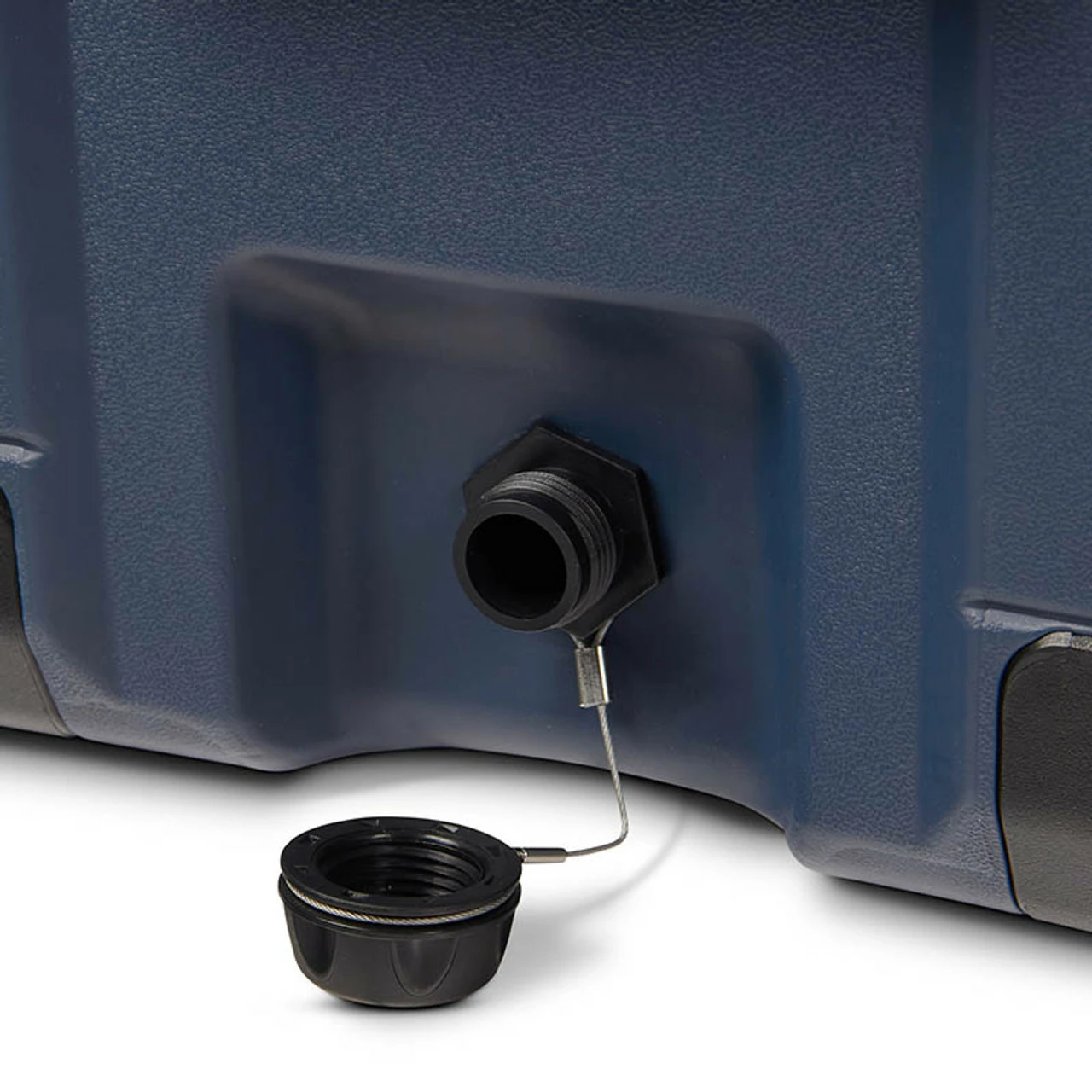 - Hose compatible threaded drain plug with tethered cap