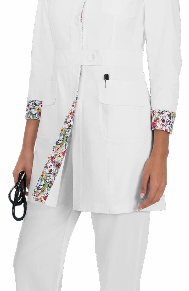 Printed lining is the defining detail on this koi Women’s Geneva Contrast Lining 35ยพ” Lab Coat. A rounded collar and seamed waistline add an even more feminine appearance.